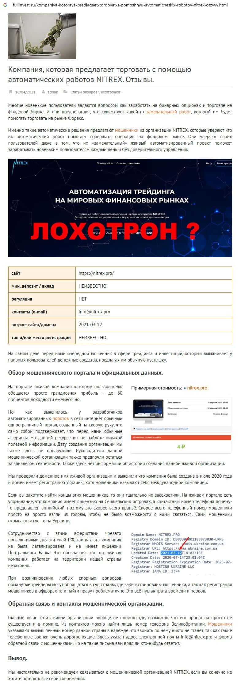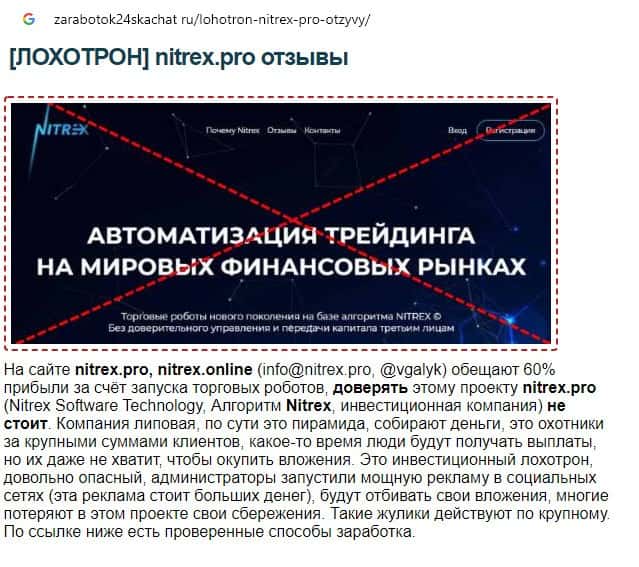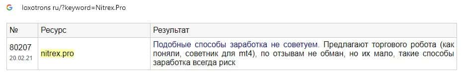 Веб-сервис лохотронс ру не рекомендует такие формы заработка, как предлагают мошенники Nitrex, слишком велик риск потерять вложенные денежные средства.