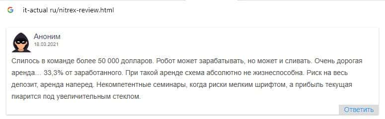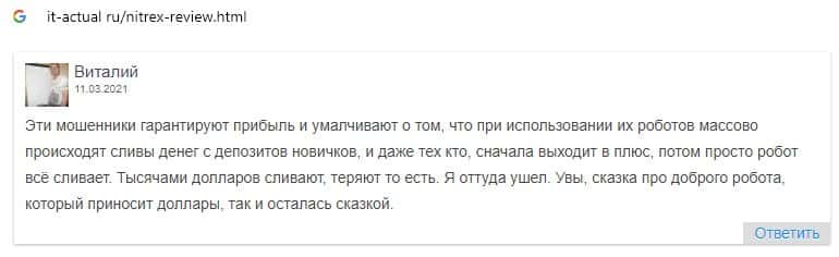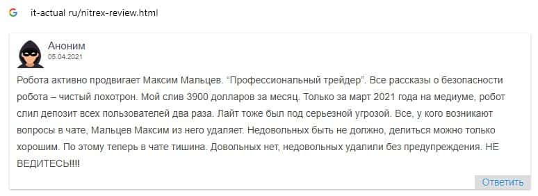 Пользователь также убедился в том, что перед ним мошенники Nitrex, которые в первый же день слили весь депозит с помощью торгового робота.