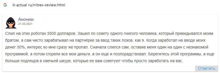 Шулера Нитрекс кинули очередного пользователя на немалую сумму денежных средств, о чем свидетельствует данный отзыв.