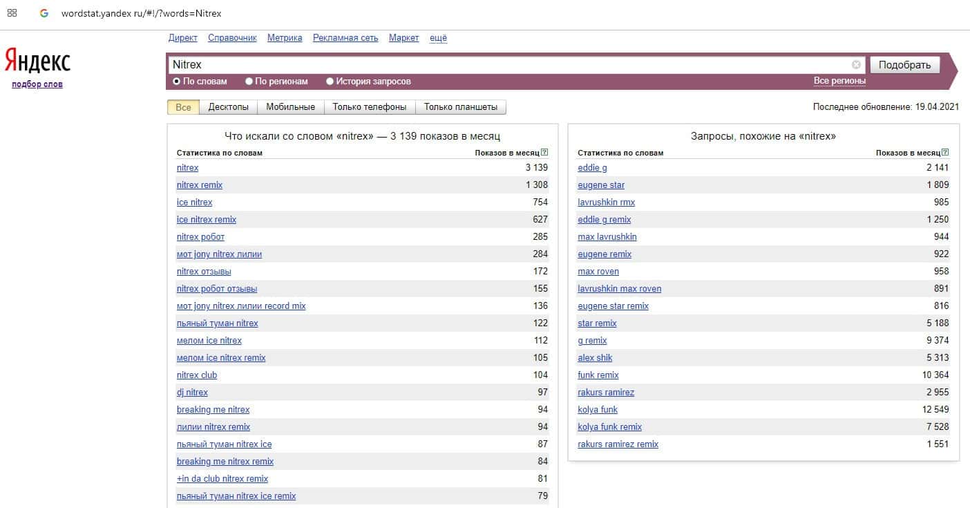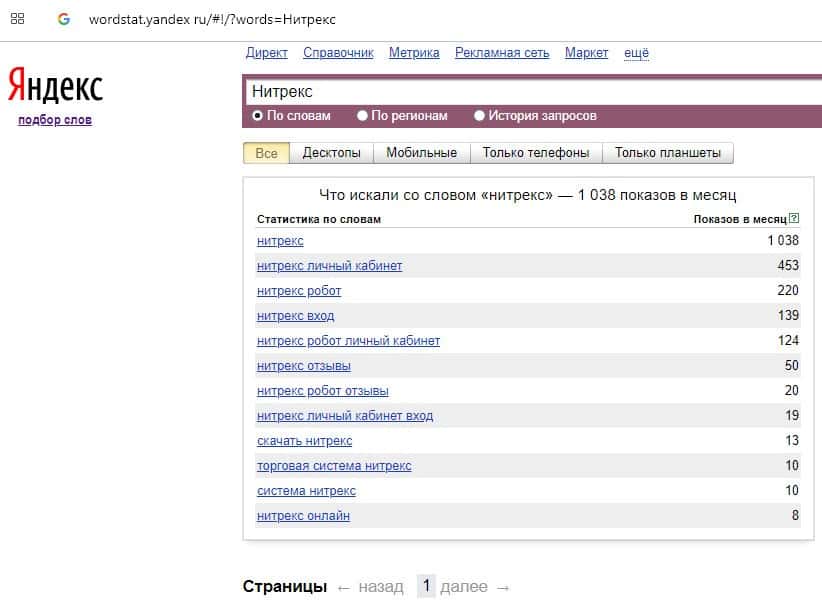 Количество запросов по бренду названия компании на русском языке "Нитрекс" на Вордстарт Яндекс Ру составило 1038 запросов за месяц.