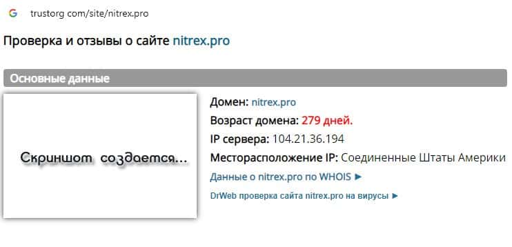 Проверка веб-сервиса обманщиков Nitrex на trustorg com показала, что возраст домена к моменту написания статьи составляет 279 дней, скорее всего домен купленный.