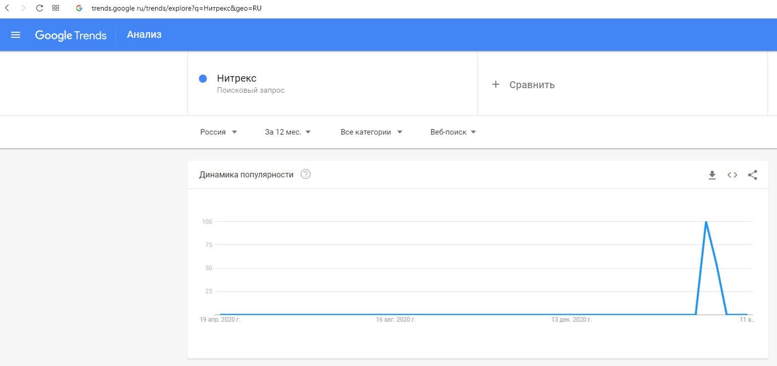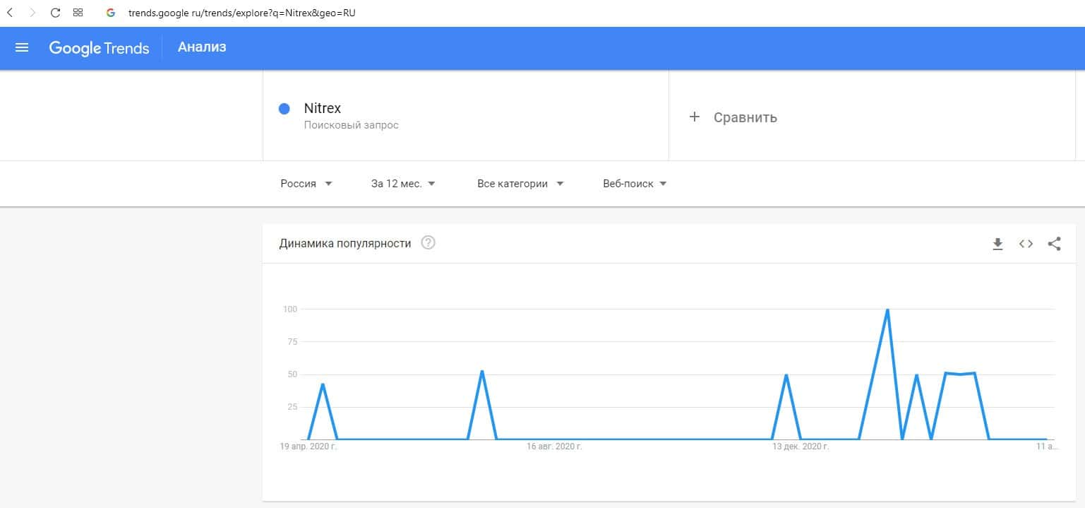 Динамика количества запросов по бренду названия компании на русском языке "Нитрекс" на Трендс Гугл Ру предоставлена на графике на скриншоте ниже.