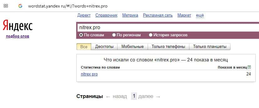 Количество брендовых запросов название домена компании "nitrex.pro" на wordstat yandex ru составляет 24 показа за месяц.