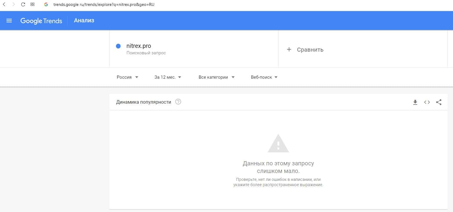 По количеству брендовых запросов название домена компании "nitrex.pro" на Гугл Трендс ничего не известно.