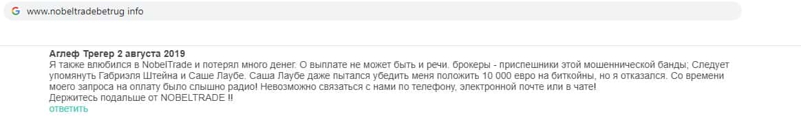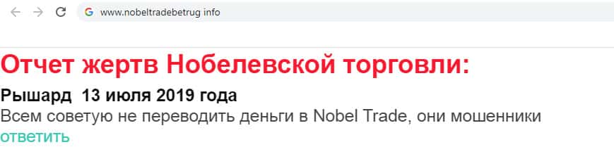 В данном отзыве о компании мошенников Nobel Trade мы видим, как пользователь призывает других пользователей не вносить деньги на счёт компании, так как они являются мошенниками. Нем повода не доверять этому пользователю, так как человек наверное уже имел печальный опыт сотрудничества с этой фирмой, и решил предупредить об этом остальных.