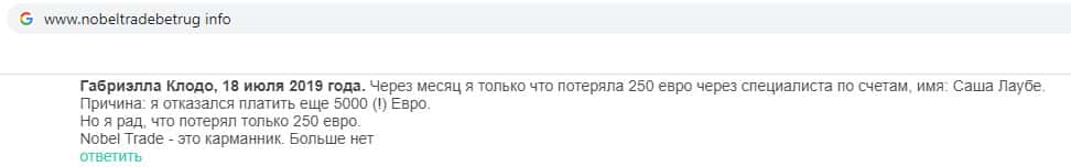 Некий Саша Лаубе, который являясь менеджером фирмы разводил Нобел Трейд - хотел вытянуть с клиента 5000 евро, но клиент вовремя остановился, так как в нём заговорил здравый смысл, и он понял что это мошенники. В итоге пользователь потерял лишь 250 евро, вместо 5000, и рад тому, что не повёлся на уговоры фирмы, а то остался бы ни с чем.
