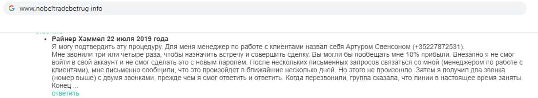 В данном отзыве мы видим как клиент компании кидал Nobel Trade рассказал о том, что сотрудничал с фирмой, и вносил депозиты, но потом нашёл информацию о том, что они мошенники и перестал сотрудничать. В его отсутствие ему звонил его менеджер, но когда клиент решил перезвонить, то номера телефона больше не существовало.