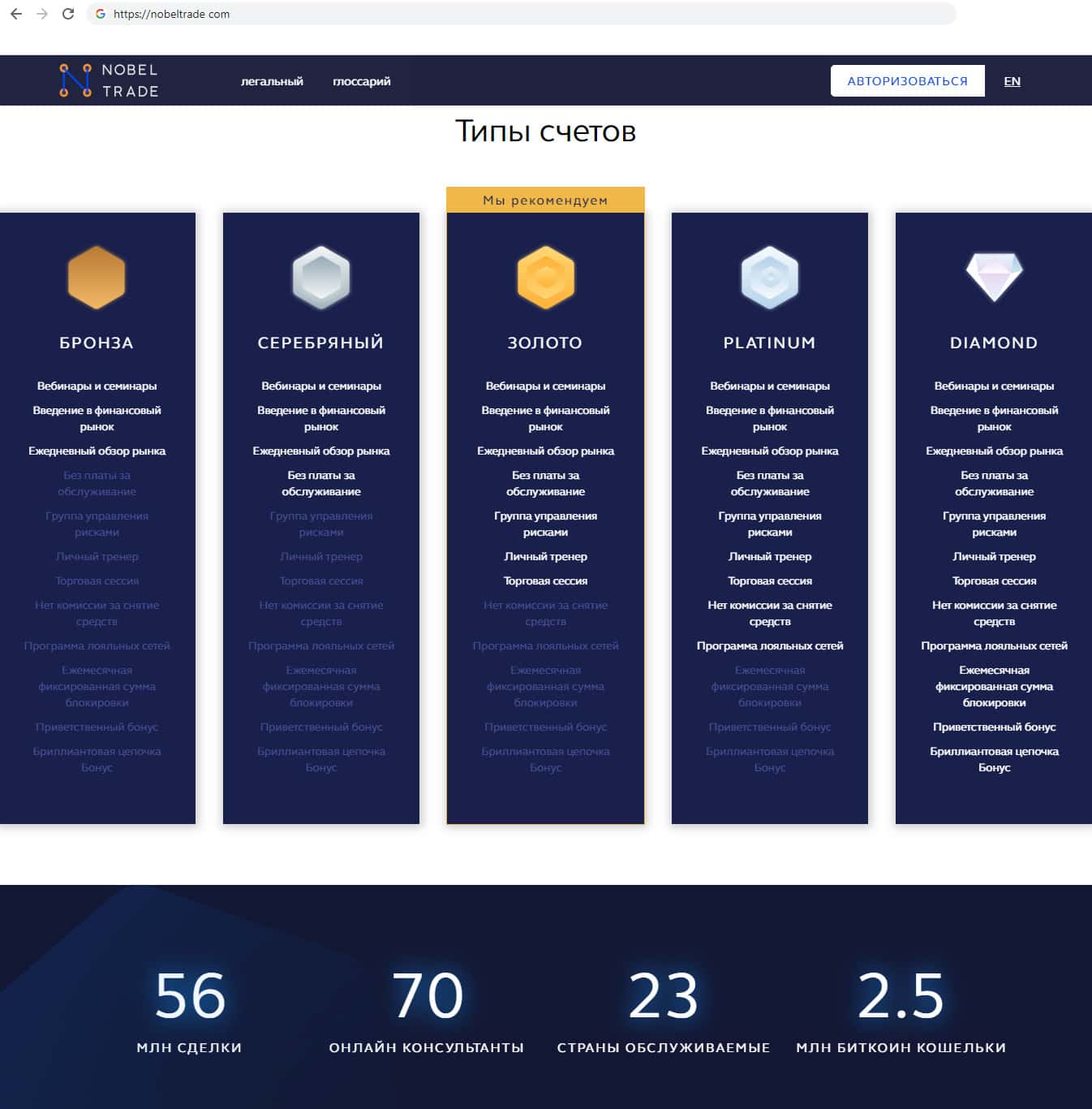 Кидалы Нобел Трейд предлагают своим клиентам несколько видов счетов, которые отличаются минимальным депозитом и количеством псевдобонусов. Жулики утверждают что чем дороже счёт, тем выгоднее он для клиента, но это ошибочное мнение, так как кидалы не собираются исполнять свои обещания, а просто заставляют клиентов покупать дорогие счета.