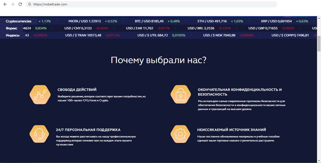 Первым пунктом после вступления компания разводил Нобел Трейд рассказывает почему пользователи должны выбрать именно того брокера. И именно тут компания начинает лгать. Она обещает круглосуточную поддержку, свободу действий, так же лжёт о том, что личные данные клиента очень хорошо защищены, и то, что они являются неиссякаемым источником знаний.