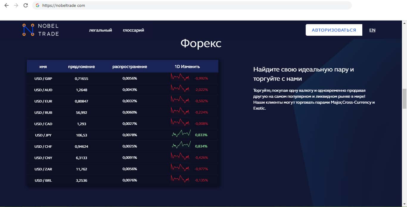 Так же после торговой площадки компания представила валютные пары, и предлагает клиенту выбрать одру и торговать с ней. По словам фирмы нужно торговать, покупая одну валюту и одновременно продавая другую на самом популярном и ликвидном рынке в мире. Но это всего лишь способ манипуляции, которым пользуются кидалы Nobel Trade.