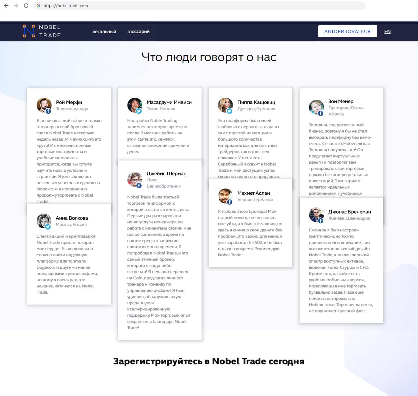 Так же мошенники Нобел Трейд на своём сайте представили пункт с якобы отзывами клиентов. Вниманию посетителей сайта представлены отзывы трейдеров, которые работают с данной конторой. Но на самом деле это все лишь нарисованные отзывы, так как настоящие отзывы не такие положительные. Это всего лишь фальшивая информация.