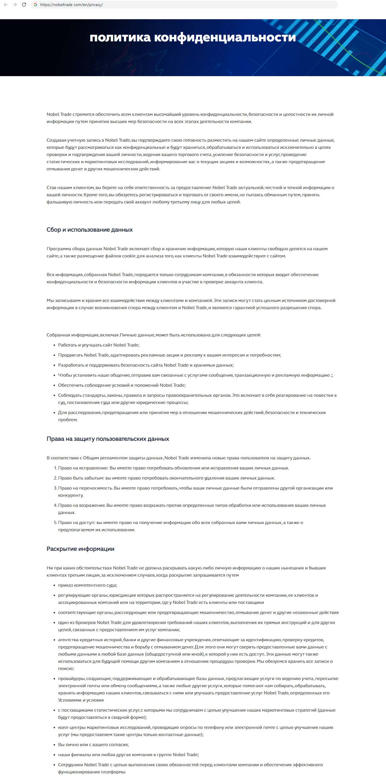 - Политика конфиденциальности лжеброкера Нобел Трейд