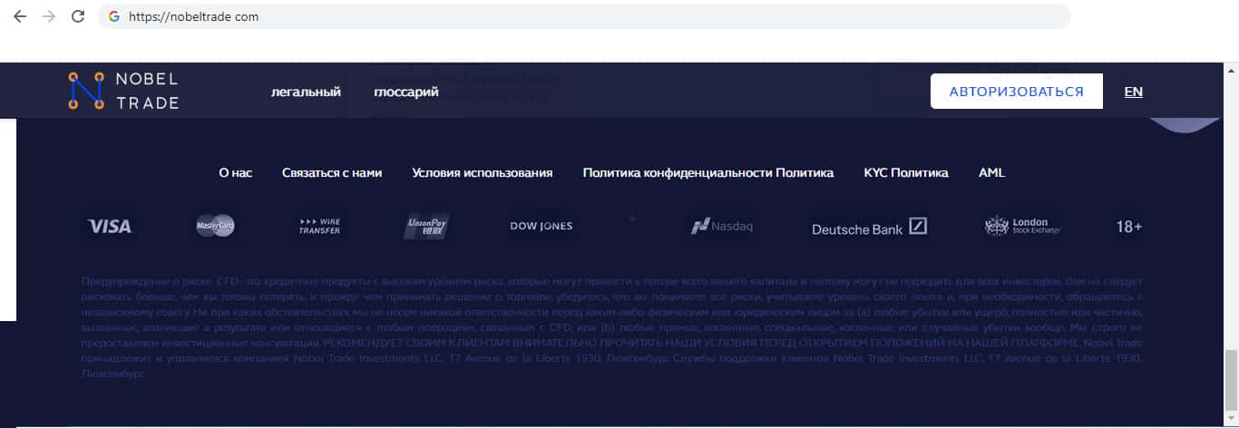 Так же на своём сайте жулики Nobel Trade предоставили предупреждения о рисках. Это предупреждение размещено в самом конце сайта, и почти незаметно, что неопытный пользователь даже не обратит на него внимания. Но это будет ошибкой, так как компания отказывается от любого рода ответственности и перекладывает все риски на клиента.