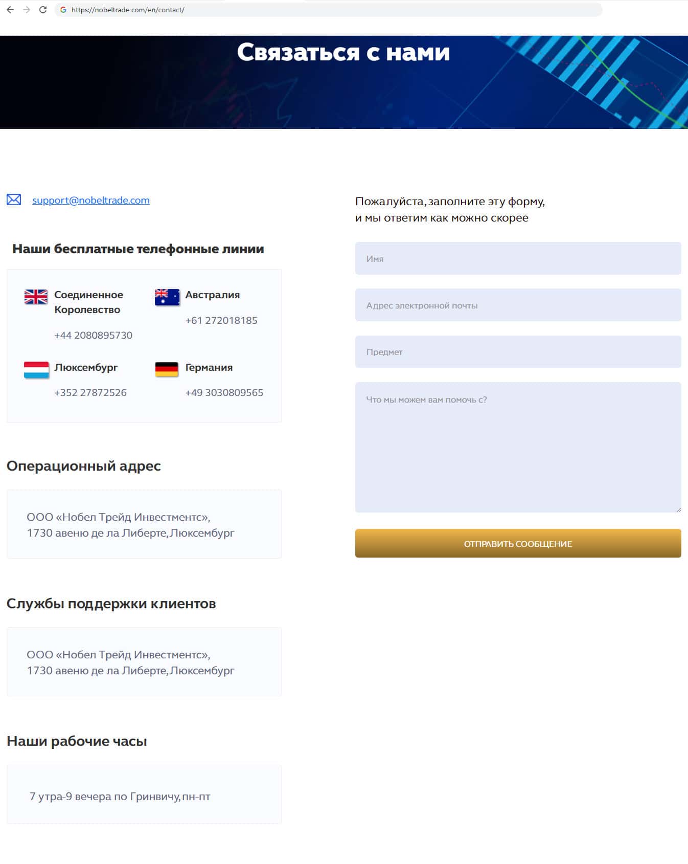 Лохотрон Нобел Трейд предоставил свои контактные данные, с помощью которых клиент может связаться с фирмой, но увы, это не так. Контакты служат для того. что бы сотрудники фирмы связывался с клиентами, пока они инвестируют, но как только мошенники вытянуть из пользователей всё до копейки, то клиенты становятся не нужными. Контакты мошенников: