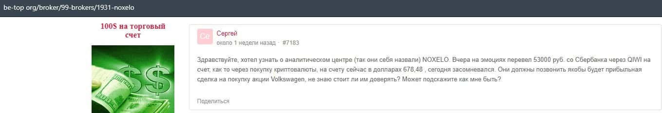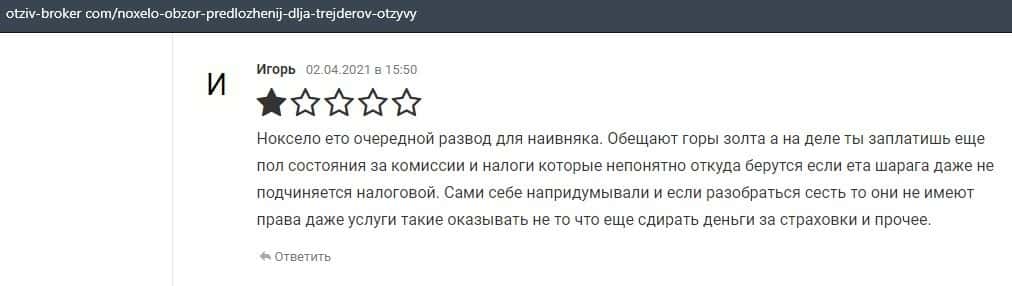 Еще один пользователь сети высказал свое недоверие к конторе Ноксело. По его мнению это мошенники, которые ищут наивную клиентуру и под предлогом торговли, выманивают деньги.