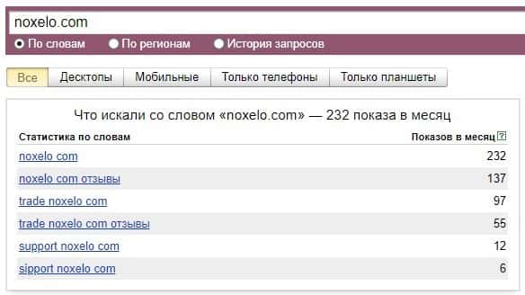 Почти такие же показатели и запроса бренда их интернет-сайта. Бренд "noxelo.com" набрал за последний месяц 232 показа по версии Яндекс.Вордстат.