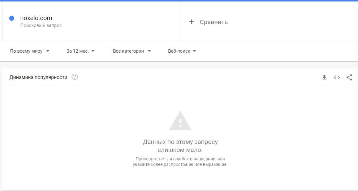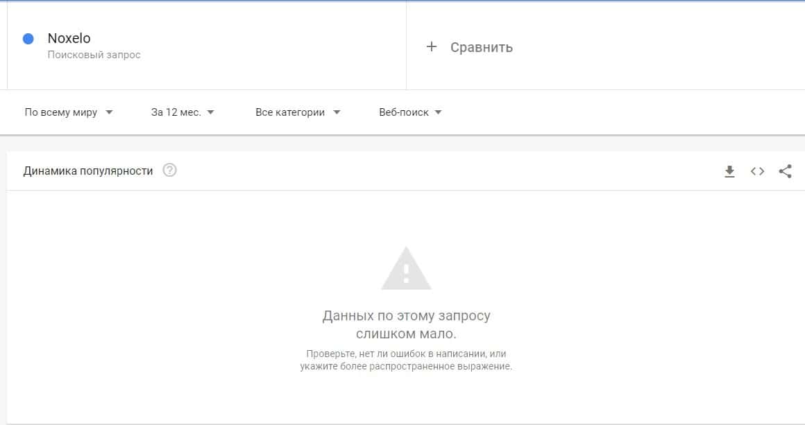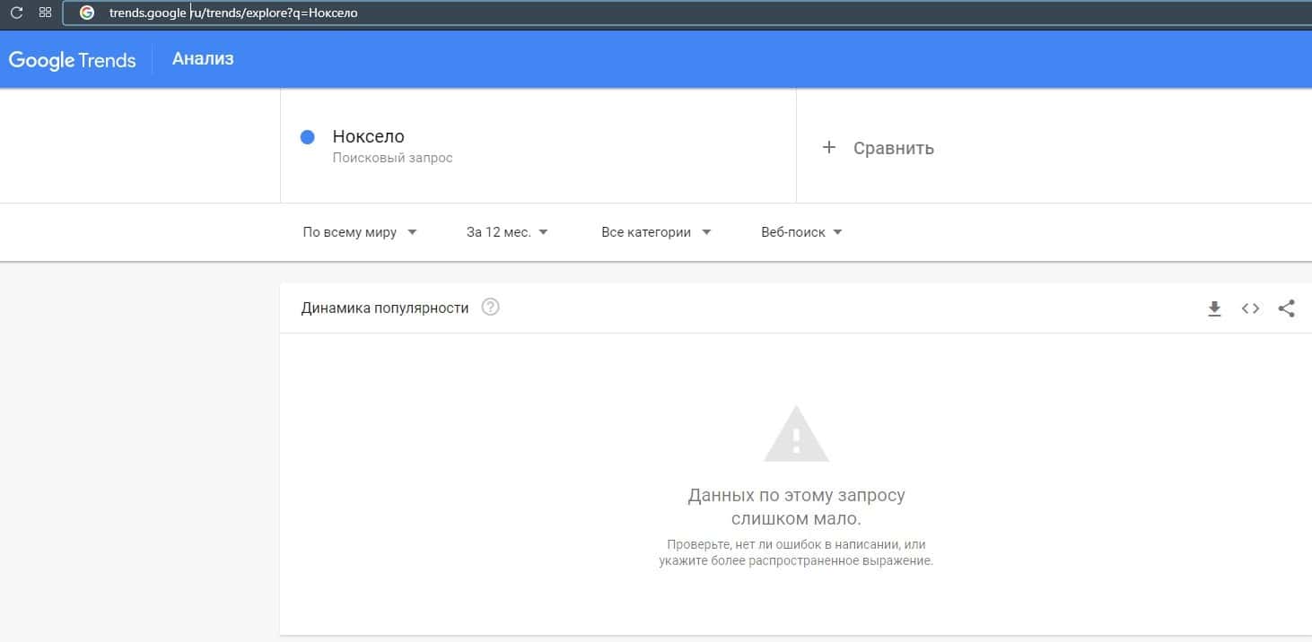 В данном случае мы проверили по версии ресурса Гугл Трендс бренд конторы в таком варианте "Noxelo" и система не выдала запросы вообще.