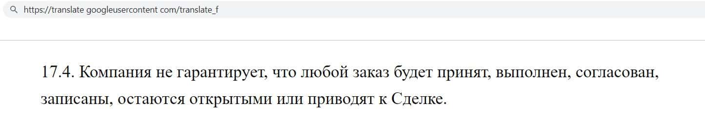 А вот ещё один сомнительный пункт соглашения, в котором аферисты Номинекс указали, что компания не гарантирует, что сделки будут приняты, выполнены или согласованны.