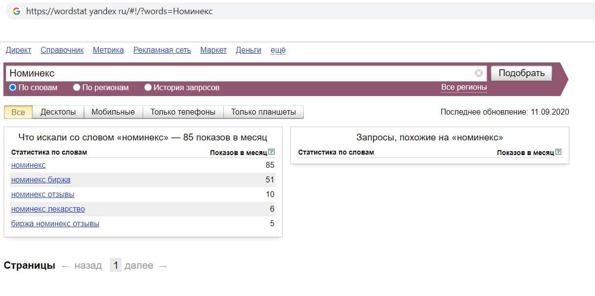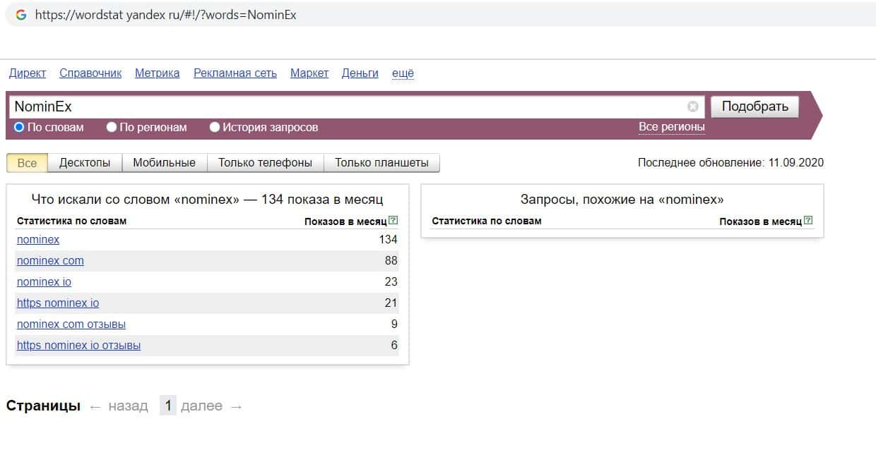 Мы проверили количество запросов компании NominEx в Яндексе по названию фирмы, а именно "NominEx". 134 раза пользователи совершали данный запрос в течении месяца.