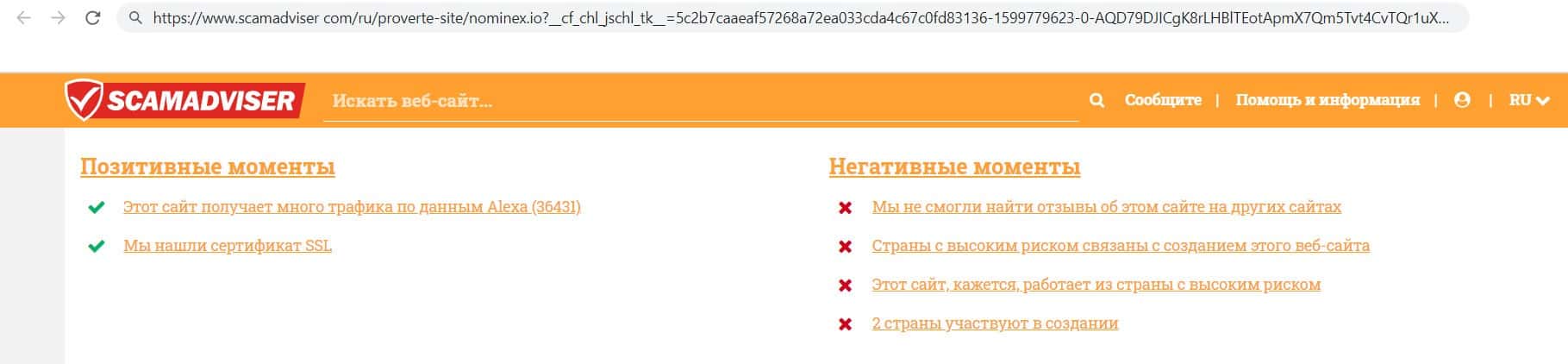- Мнение интернет ресурса scamadviser com о конторе жуликов Номинекс