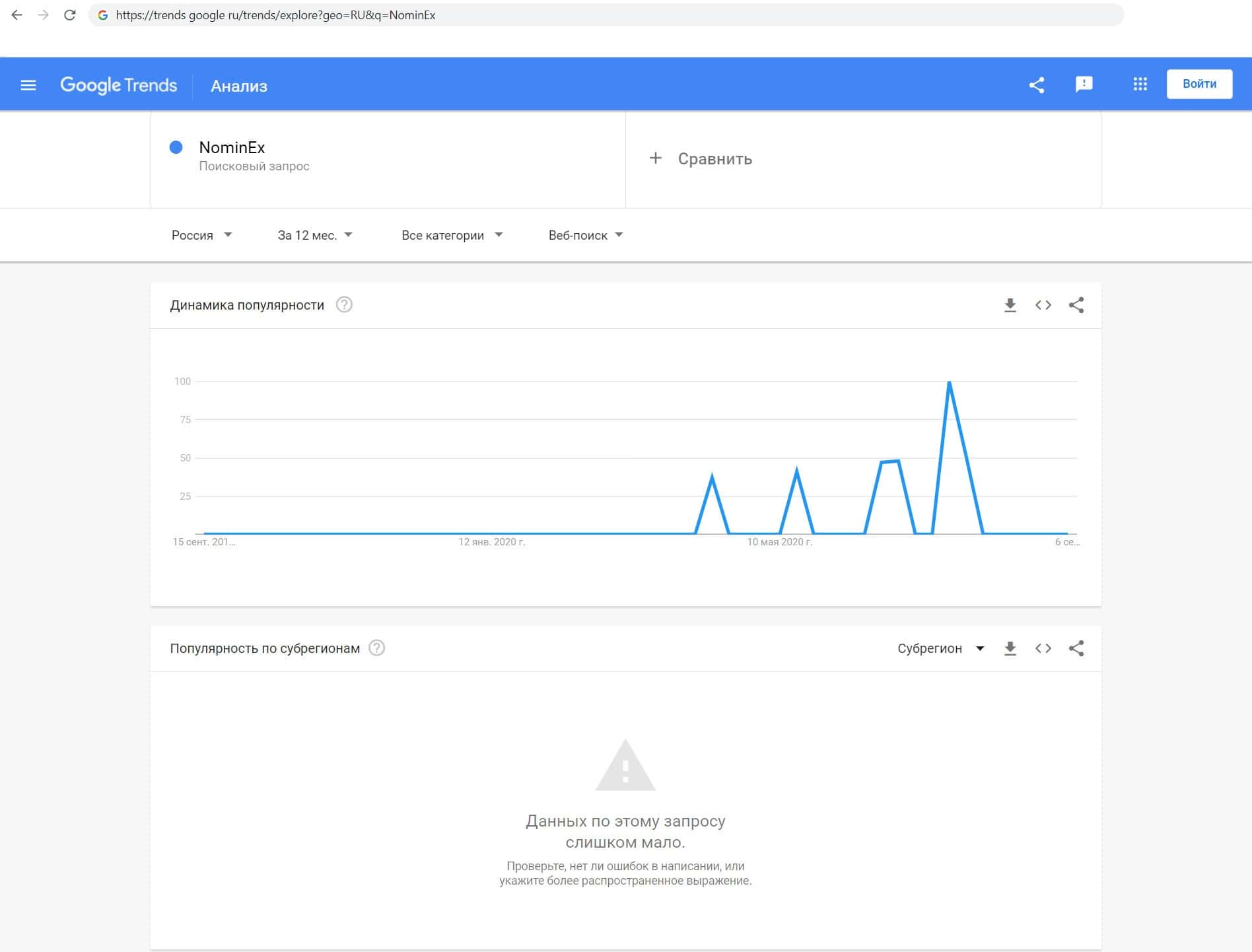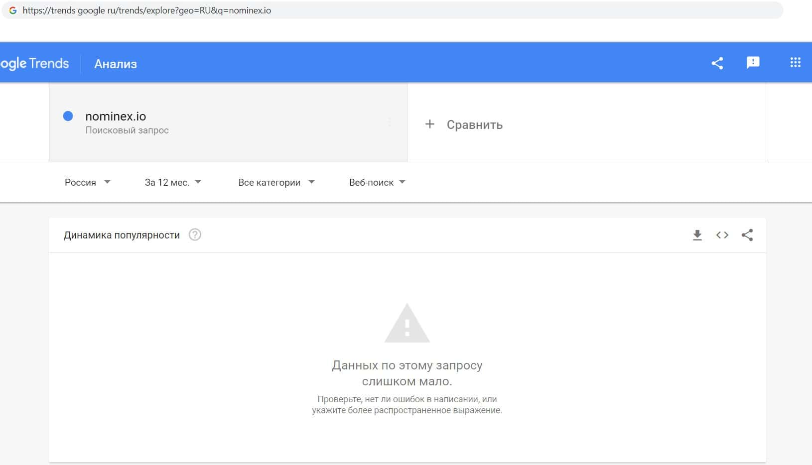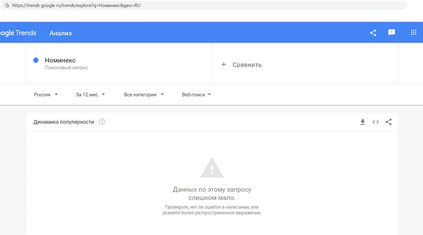 Мы проверили количество запросов компании разводил Номинекс в Google по названию фирмы, а именно "NominEx". Данный запрос не пользуется большой популярностью среди пользователей.