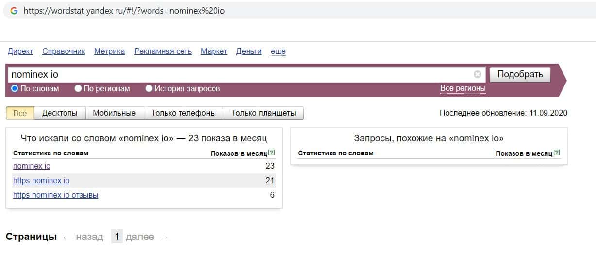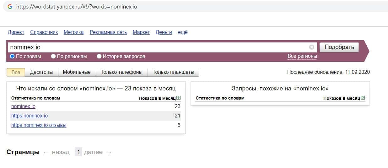 Ещё мы проверили количество запросов компании махинаторов Номинекс по домену фирмы без точки, а именно "nominex io". Но и этот запрос никто из пользователей не выполнял.