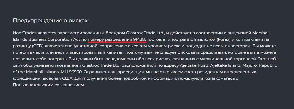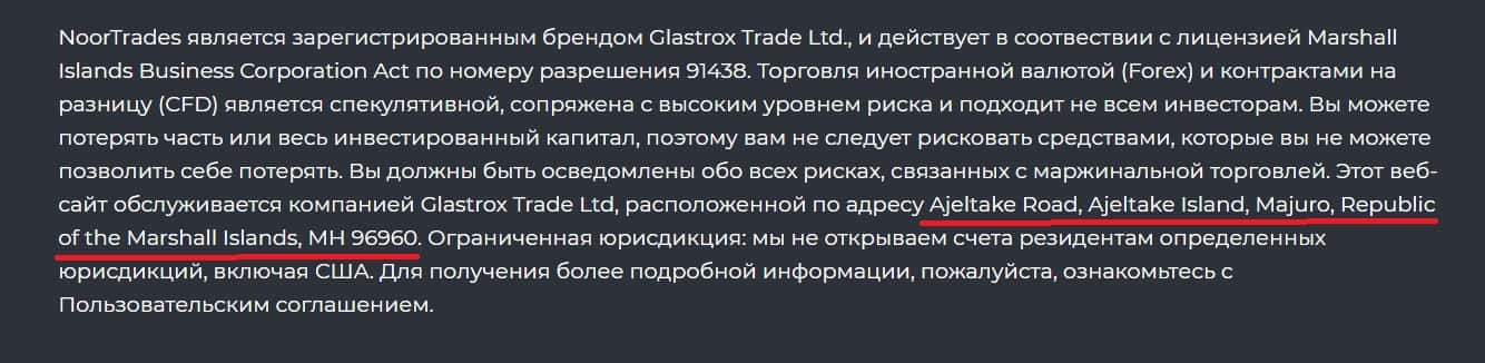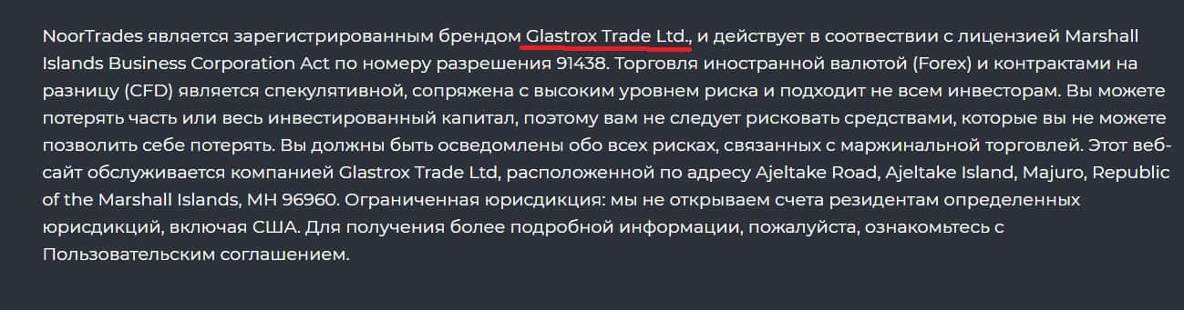 Юридическим лицом, действующим от имени брокера Ноор Трейдс, судя по данным с сайта, является компания Glastrox Trade Ltd, с адресом в офшорной зоне.