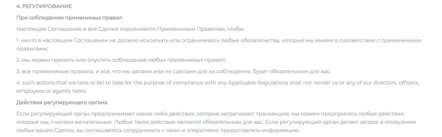 В пункте 4 брокерская компания Ноор Трейдс описывает регулирование клиентского соглашения, а также действия клиента по отношению к регулирующему органу.