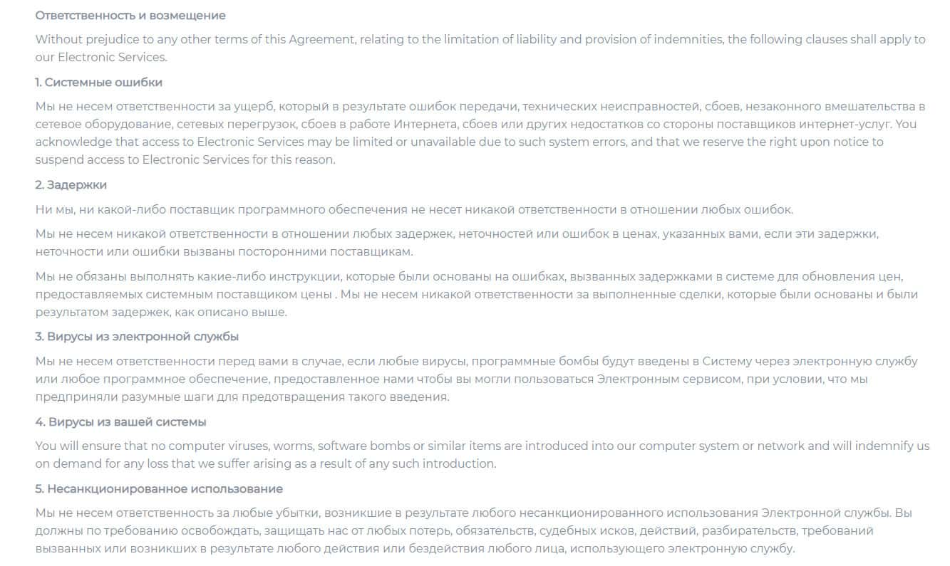 В подразделе Ответственность и возмещение брокер Ноор Трейдс говорит о том, что он снимает с себя любую ответственность за оказываемые услуги и убытки клиента.