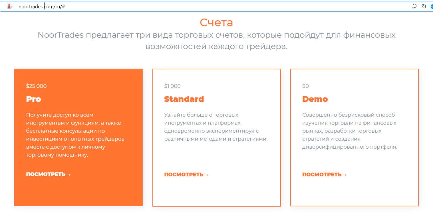 В компании Ноор Трейдс существует три типа счетов, но информации о них почти никакой не дается. Это потому, что брокерская контора таковой не является, она фальшивая.