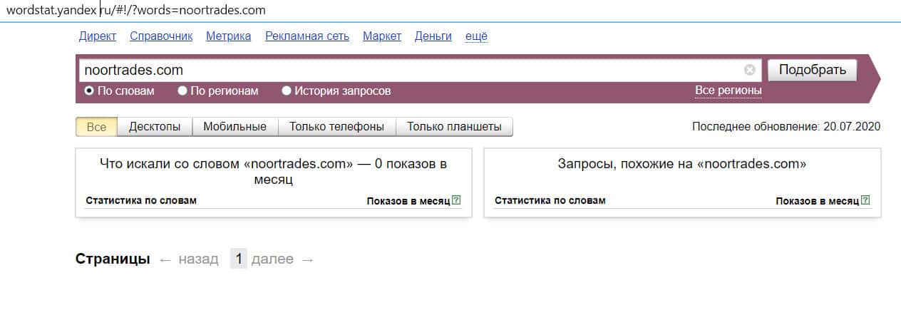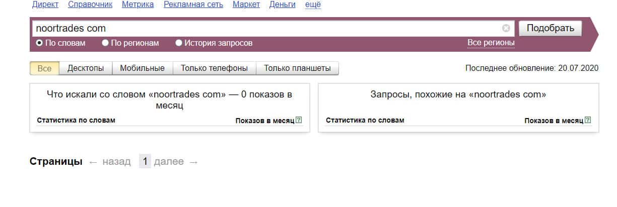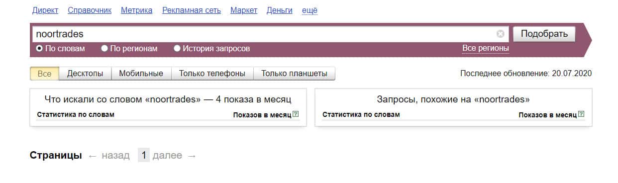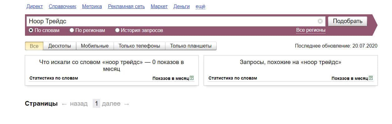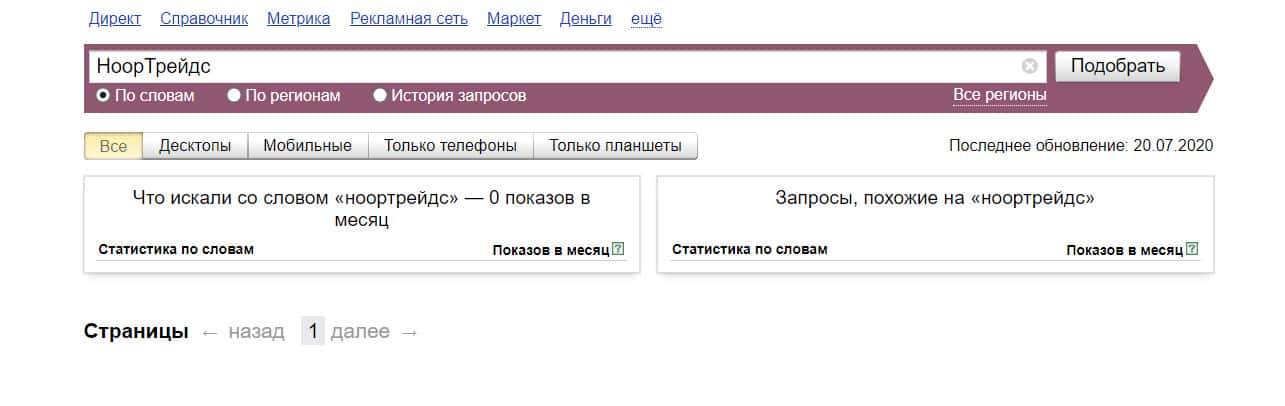 Посмотрим, сколько раз люди искали название бренда "Ноор Трейдс" на русском языке с пробелом: результат нулевой.