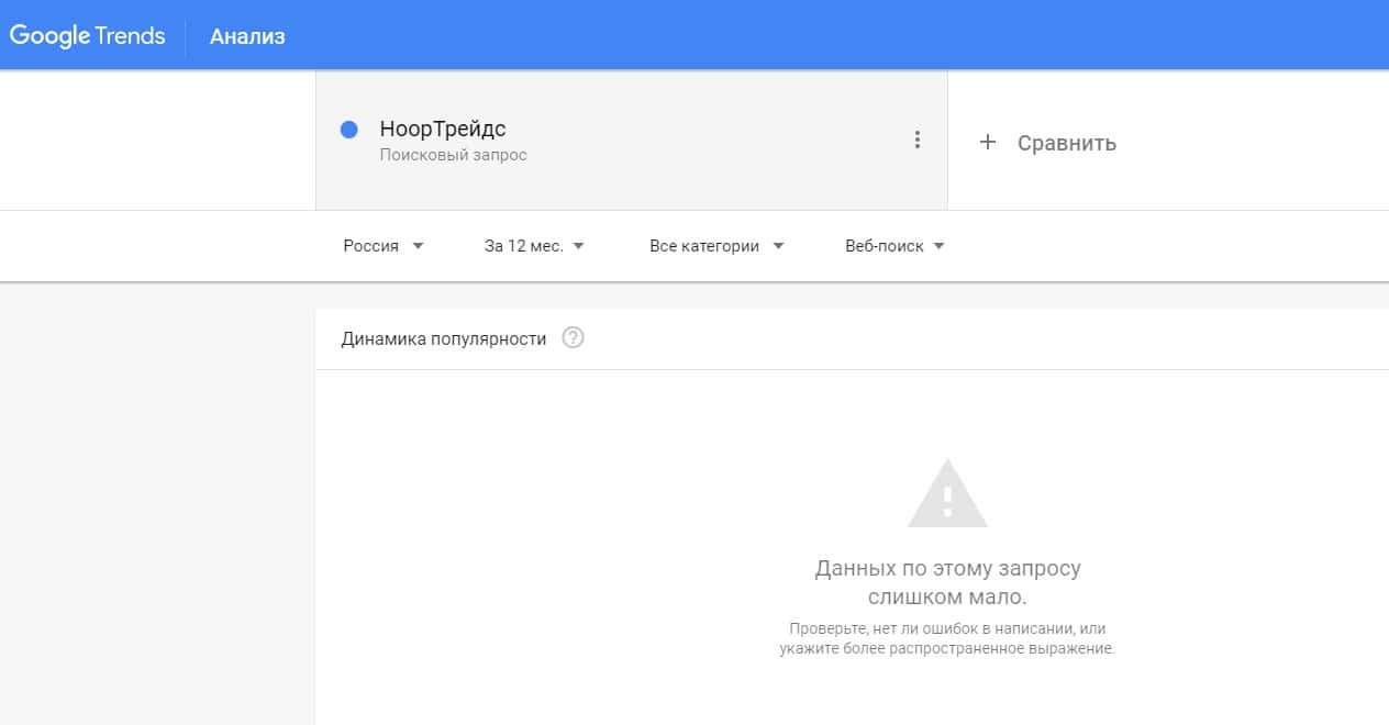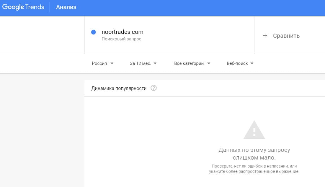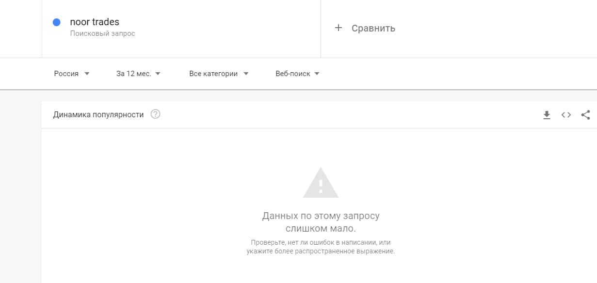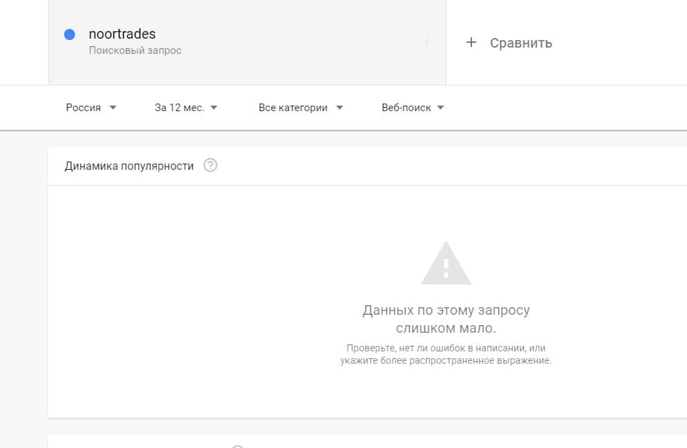 Посмотрим, насколько популярно название бренда "noortrades", написанное на английском языке. Данных по этому запросу нет, так как никто не искал этот бренд в Гугл.