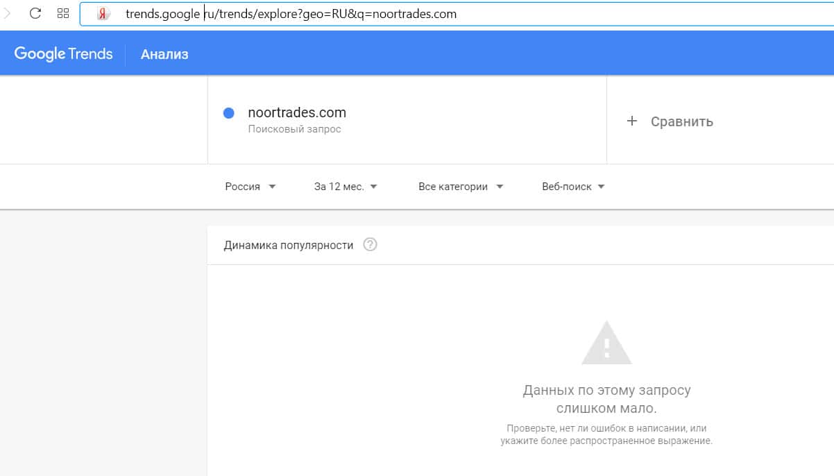 Доменное имя мошеннического сайта "noortrades.com" вбивали в поисковую систему Гугл слишком редко, поэтому данных по этому запросу практически нет.