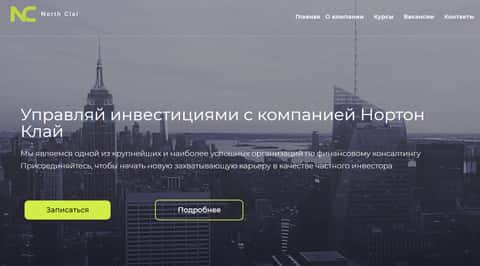 Начинается сайт у лохотрона North Clai с типичной шапки сайта, уже в которой мошенники Нортон Клай начинают навешивать лапшу о том, что они являются лучшей компанией в своей сфере и предлагают наивным пользователям сети начать зарабатывать вместе. На изображении, расположенном ниже, вы можете увидеть начало сайта жуликов North Clai.