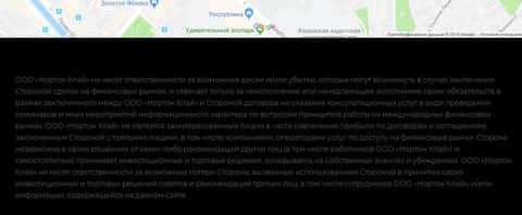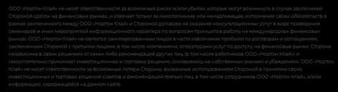 Завершается сайт у лохотрона Нортон Клай довольно ожидаемо, а именно кратким списком контактов, а так же типичным отказом от ответственности, в котором мошенники North Clai заявляют о том, что не несут ответственности за консалтинговые услуги и обучение инвестированию, предоставляемые ими, о чем вы можете прочесть на изображении ниже.
