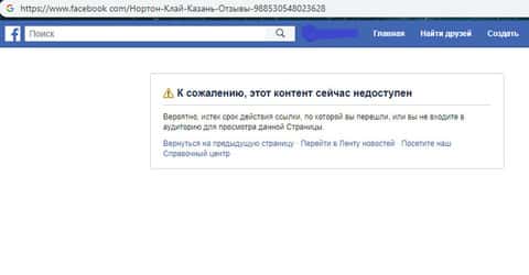 Дабы соответствовать современным трендам шулера Нортон Клай решили обзавестись страницами в различных социальных сетях, одной из которых стала Facebook. Однако при переходе на данную страницу по ссылке с сайта мошенников North Clai выскочит уведомление о том, что данная страница попросту не доступна, что вы можете увидеть на изображении ниже.