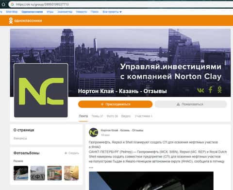 Единственной рабочей группой у мошенников North Clai является страница в социальной сети Одноклассники, которая не содержит в себе подписчиков и к тому же заброшена и током не обновляется, что говорит об еще одной халтуре со стороны аферистов Нортон Клай. На изображении, расположенном ниже, вы можете увидеть страницу шулеров North Clai в социальной сети Одноклассники.