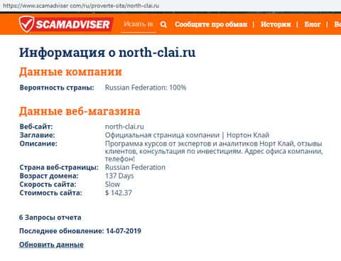 В связи с мошеннической и противозаконной деятельностью жуликов North Clai их реальные руководители предпочитают анонимность дабы избежать ответственности со стороны правоохранительных органов. Даже портал scamadviser com не рекомендует иметь дело с аферистами Нортон Клай, информацию о сайте которых вы можете увидеть на изображении ниже.