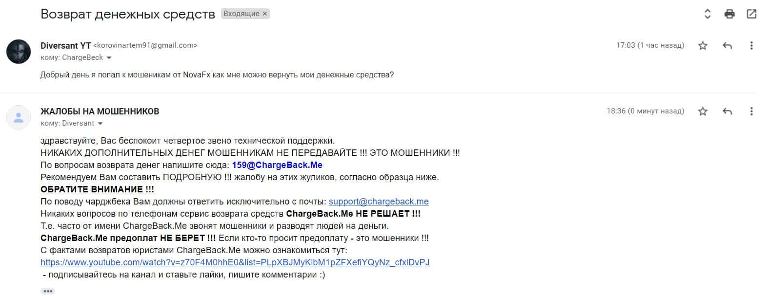 Третий способ, по которому вы можете связаться с мошенниками Нова ФХ - это адрес электронной почты, куда вы также можете попробовать им написать, если ответят: