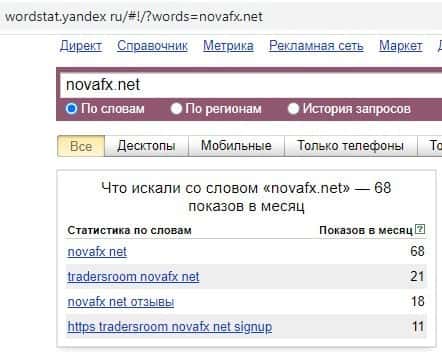 И последний запрос в яндексе на английском языке с точкой "novafx.net" выдает результат в 68 показов в месяц. Это меньше, чем во всех предыдущих случаях.