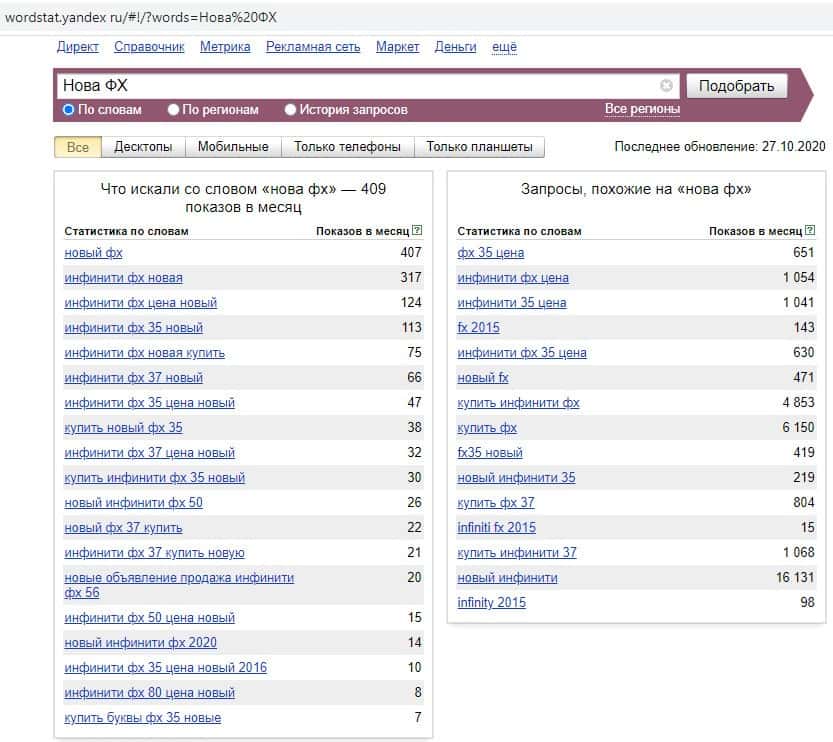 Начинаем с запроса на русском языке. Первый запрос в яндексе на русском языке с одним пробелом "Нова ФХ" выдает результат в 407 показов в месяц.