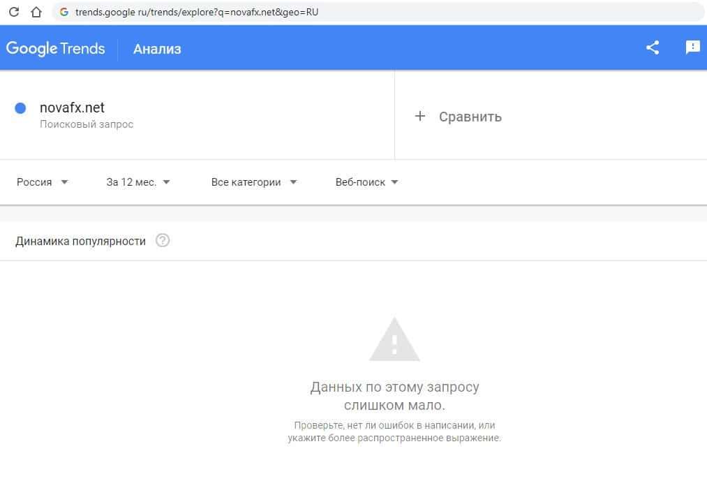 Третий и последний запрос в гугл на русском языке с пробелом "novafx.net" выдает точно такой же результат, как и во всех предыдущих случаях - 0 показов в месяц.