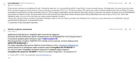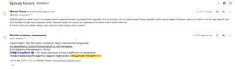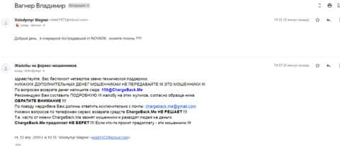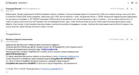 В компанию по возврату средств из форекс-лохотронов ChargeBack.Me пришла еще одна жалоба на контору Новерк в связи с тем, что кухня украла у него не малую сумму денег. Шулера навешали ему лапши на уши и выманили у него все сбережения. Чтобы вывести деньги, жульбаны ставят условия при которых нужно перевести еще денег, то ли на налог, то ли просто комиссию.