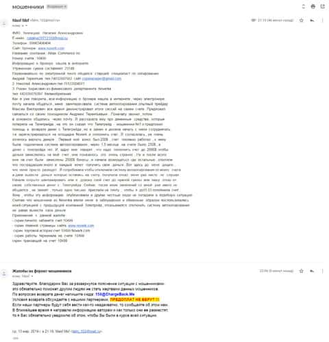 В данном случае человек попался на несколько лохотронов, а именно Новерк и ЮФТ Груп. Мошенники якобы помогают выводить средства со счетов других мошенников, но это больше похоже на какой-то развод. Так клиент лишился суммы свыше 1000 долларов и ни одна шарага не вернула ни копейки.