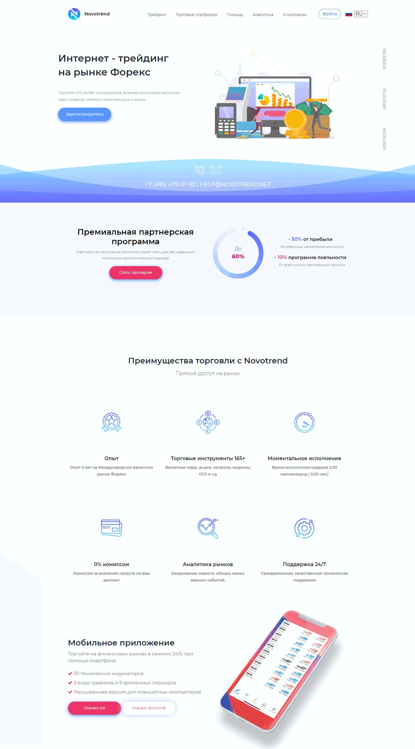 Интернет-сайт мошенников Ново Тренд занимается наглым разводом своих клиентов и, в первую очередь они используют свой сайт, чтобы запудрить мозги потенциальным клиентам. Они потратили немного денег на создание своего ресурса, а вот конкретики касательно условий торговли жулье не предоставило.
