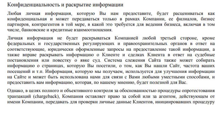 В политике конфиденциальности не все так просто, так как она двусмысленна. Жулики NovoTrend вначале документа указывают, что ни при каких обстоятельствах не разглашать личную информацию о клиентах, а потом указывают ряд исключений, через которые данные могут просочиться к третьим лицам с соответствующими последствиями.