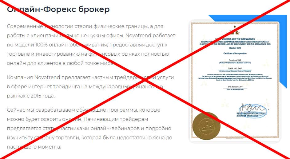 Касательно лицензии на деятельность лохотрона Ново Тренд, также есть определенные вопросы, так как на самом деле они не предоставили никаких документов. Есть только сертификат об основании компании, но таких можно создать кучу через фотошоп. Поэтому настоятельно не рекомендуем вкладывать деньги в нерегулируемого брокера.