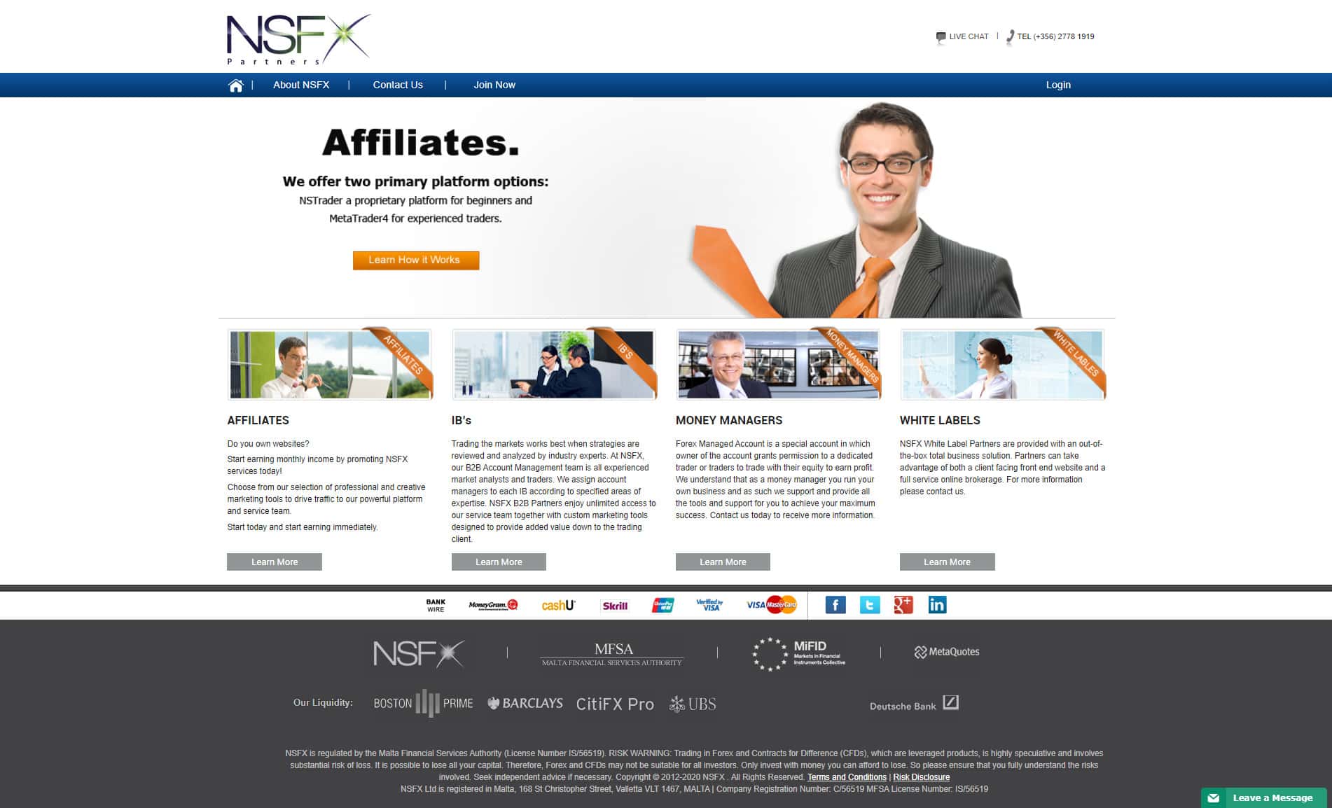 Сайт дилинговой конторы nsfxaffiliates com не внушает особого доверия, так как жулики используют одну коротенькую страничку, дабы презентовать свою деятельность. Также они наставили себе логотипы мировых банковских конгломератов, дабы подчеркнуть свой статус, но все же нормальный человек на такое не поведется.