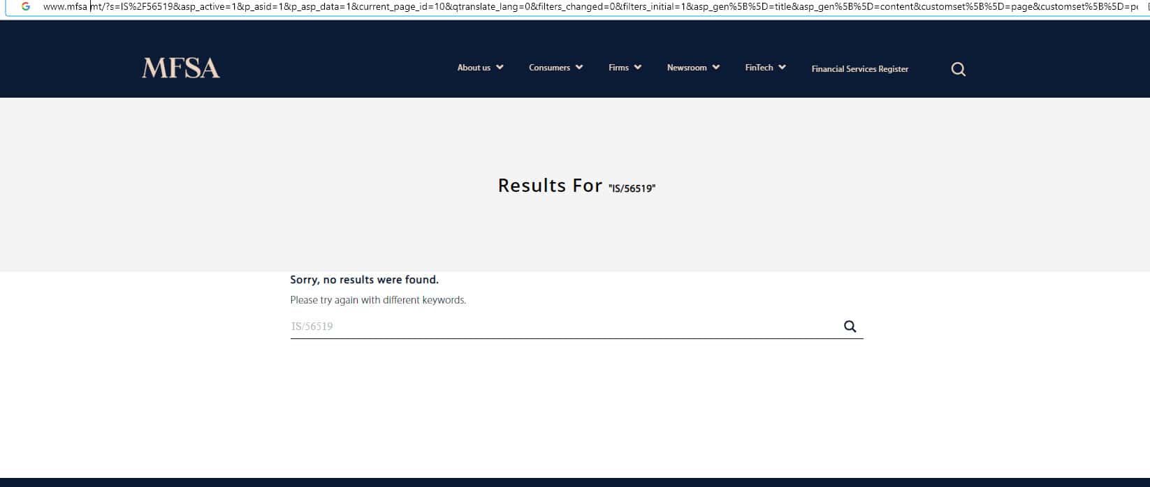 Конечно же нам стало интересно и мы решили проверить их рассказ о лицензии, перейдя на сайт того самого мальтийского регулятора. Как оказалось, никакой информации о конторе НСФХ Аффилиейтс нет, поэтому все данные, которые размещены на сайте этого лохотрона, можно в утвердительной форме заявить, что это липа.