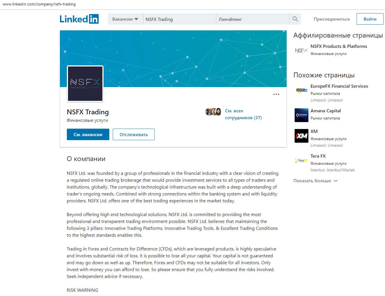 Шулерская контора NSFX Affiliates проводит определенную обработку также бизнесменов, которые могли бы также заинтересоваться торговлей на рынке Форекс. Но тут им удалось привлечь только 47 участников, с которых они мало что поимеют. И все же, для безопасности, оставим ссылку linkedin com/company/nsfx-trading